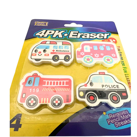 Non-Toxic Erasers Ambulance, School Bus, Police Car & Fire Brigade Shapes: 4CT