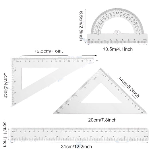 Plastic Math Set – 12" / 30 cm Ruler, Protractor, and Triangles: 4CT