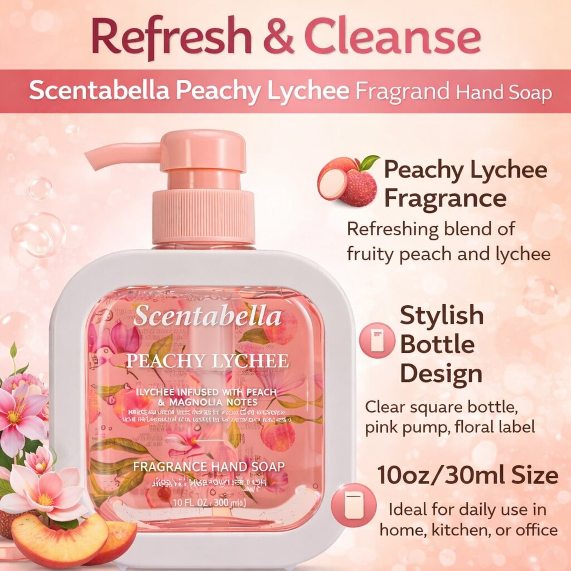 Keep your hands clean, refreshed, and pleasantly scented with Scentabella Peachy Lychee Hand Soap.
