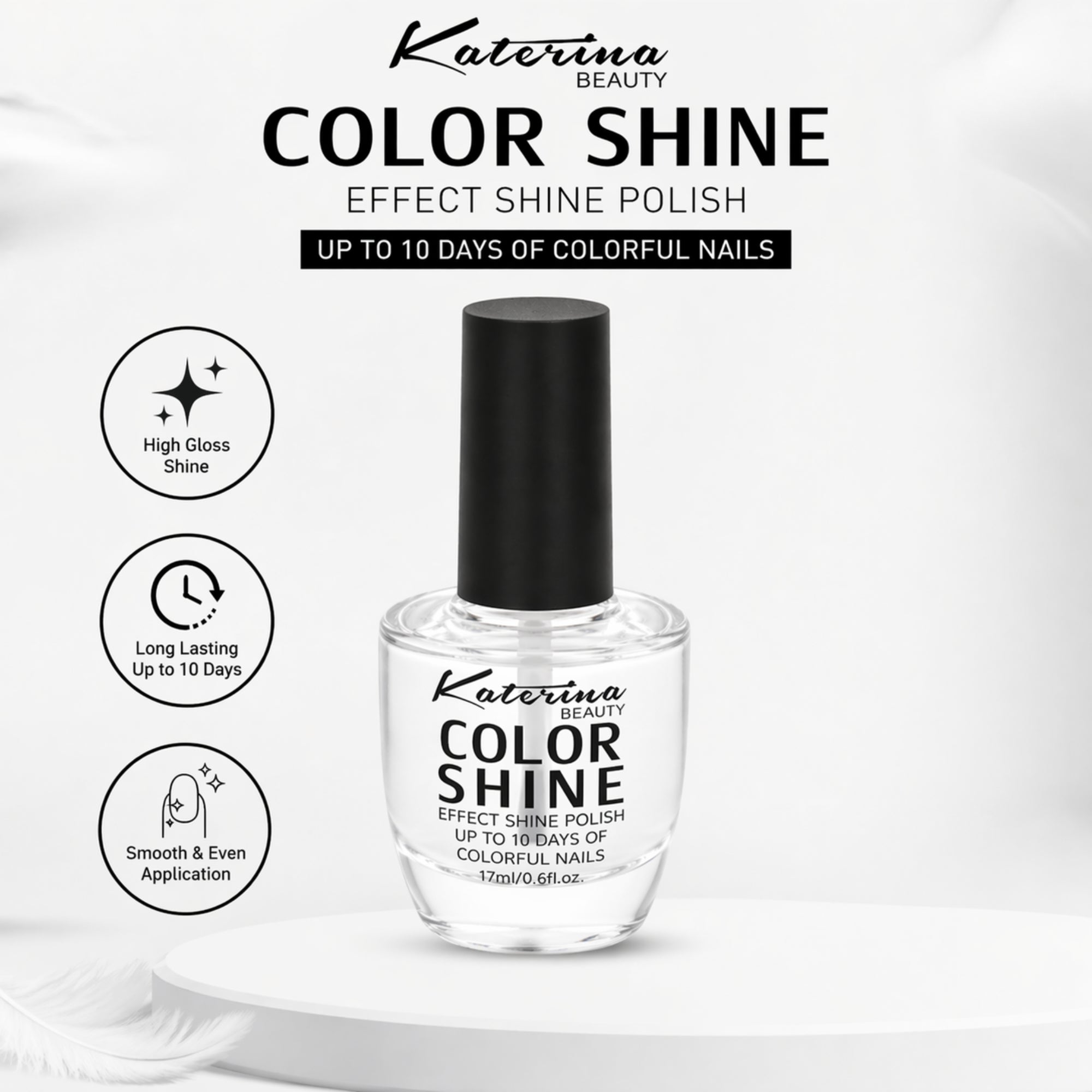 Achieve salon-quality nails at home with this high gloss shine polish designed for a smooth and even finish. Its advanced formula glides effortlessly, delivering a crystal-clear shine that enhances the natural beauty of your nails while providing a clean, polished look that lasts.