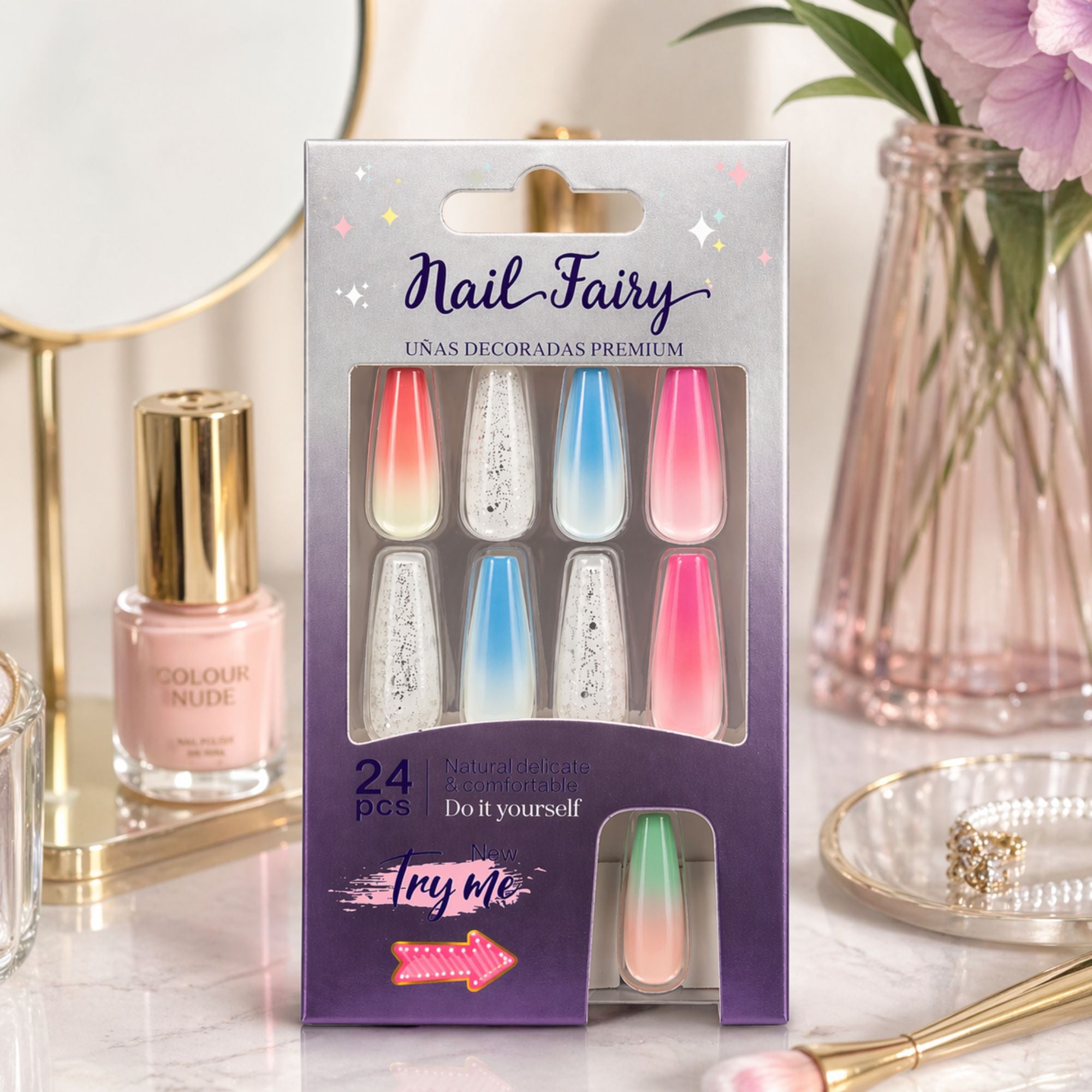 Upgrade your manicure with Nail Fairy press-on nails featuring soft pastel ombre shades combined with subtle glitter accents. This delicate and elegant design blends gentle color transitions with a modern touch, making it perfect for everyday wear or special occasions. Lightweight and comfortable, these artificial nails provide a salon-quality finish without the time or cost of professional visits.