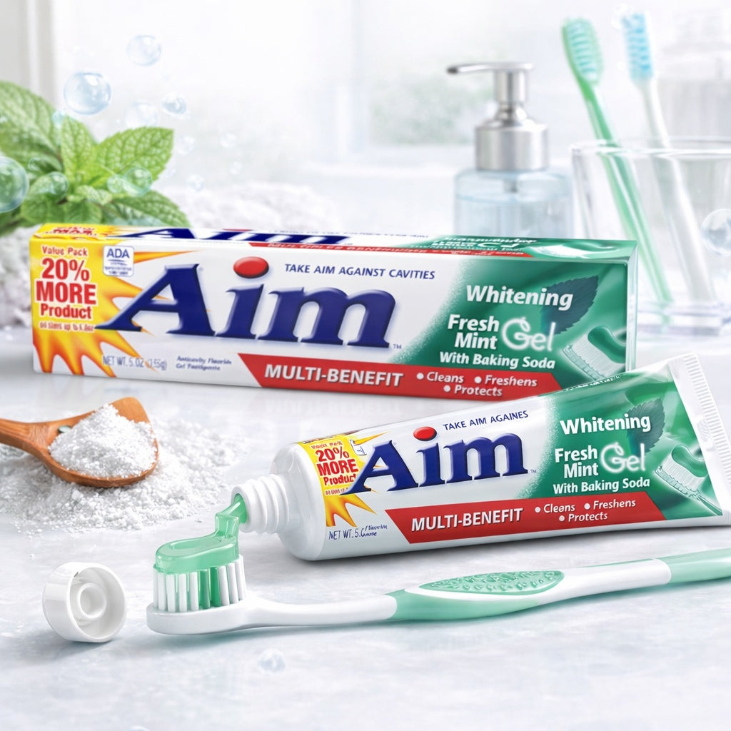 Brighten your smile with Aim Whitening Toothpaste with Baking Soda Fresh Mint (5.5 OZ). The fluoride gel formula helps whiten teeth, prevent cavities, and leave breath fresh.