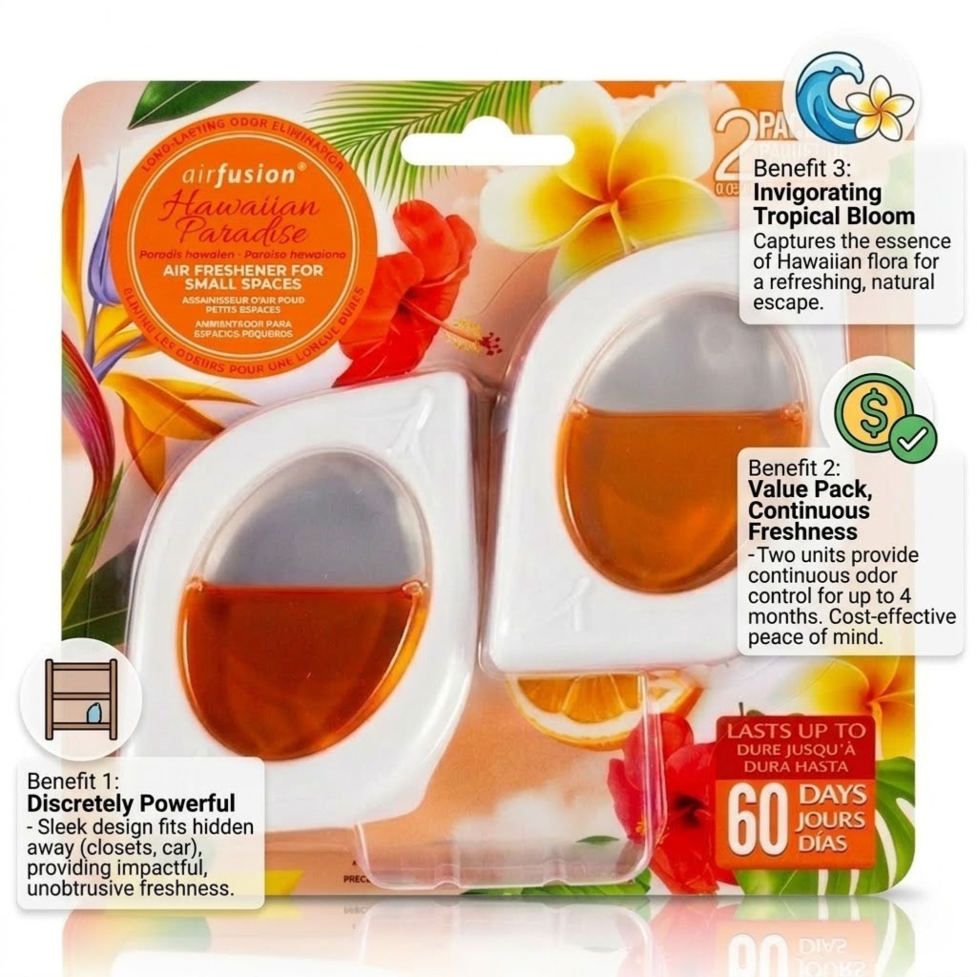 Create a refreshing tropical atmosphere with the 7.5ml Air Fusion Hawaiian Paradise Air Freshener 2 Pack Long Lasting. This air freshener delivers a vibrant island-inspired scent that helps brighten your space while reducing unwanted odors. The Hawaiian Paradise fragrance brings a sweet, tropical aroma that makes any environment feel clean, relaxing, and welcoming.