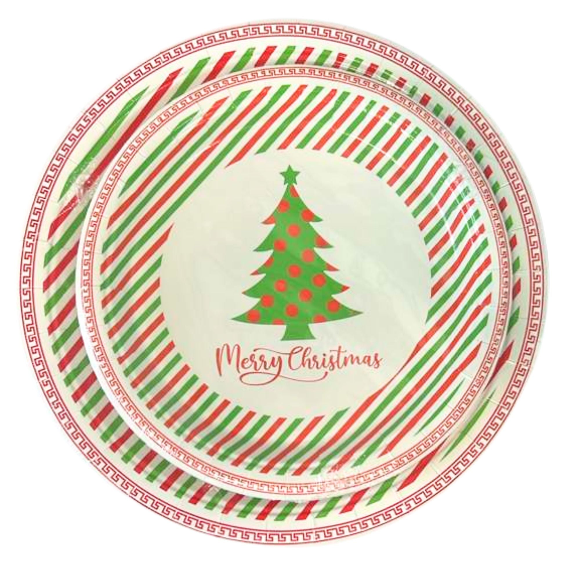 Add a festive touch to your holiday table with these disposable paper plates featuring a cheerful Christmas tree design with red and green stripes. Measuring 7 inches, they are perfect for serving meals, desserts, or party snacks. Durable and disposable, they make hosting and cleanup simple.