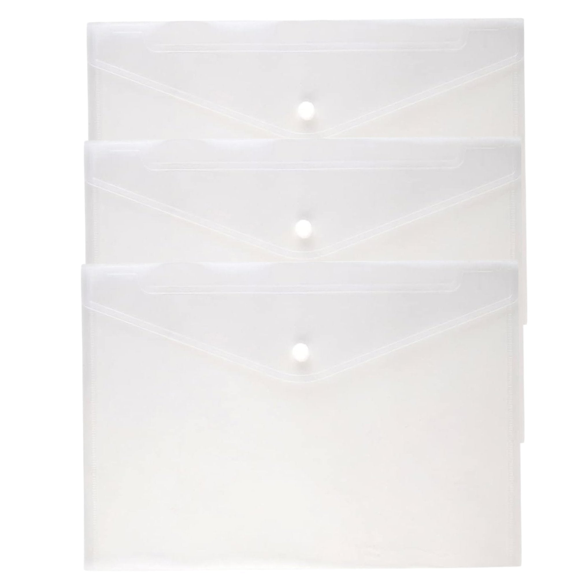 Stay organized with this 3-pack of transparent document folders, perfect for storing receipts, bills, notes, and more. Made from durable, waterproof plastic, each envelope is expandable to hold multiple sheets and features a secure snap closure for safe filing at home, school, or the office.