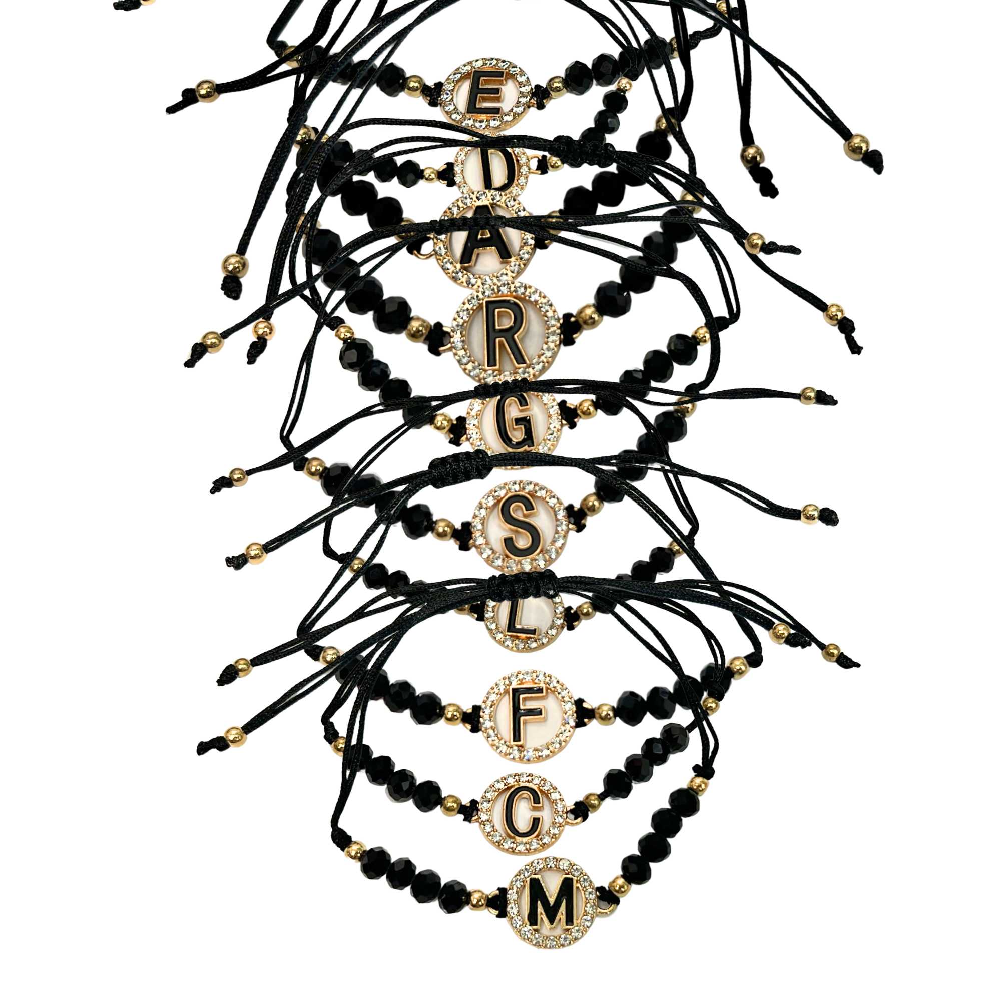 - Black beaded bracelet with gold rhinestone alphabet letter accents