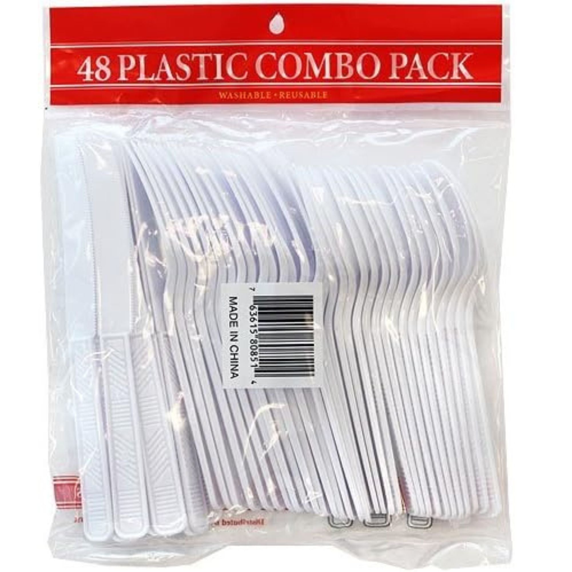 Party Dimensions White Plastic Cutlery Combo (16 each: fork, knife, teaspoon), 48 count. This item is part of a cutlery set that includes Forks, Spoons, Knives and Soup Spoons that come 48 pieces of cutlery to a bag. There are also 2 bags of combo cutlery in this color that can be purchased in either a 48 count or 36 count. Also, matching dinnerware for this color can be found in either Plastic: Plates, Bowls, Cups or Paper: Plates, Cups and Napkins. Designed for all occasions, banquets, dinners, parties, upscale catering and home.