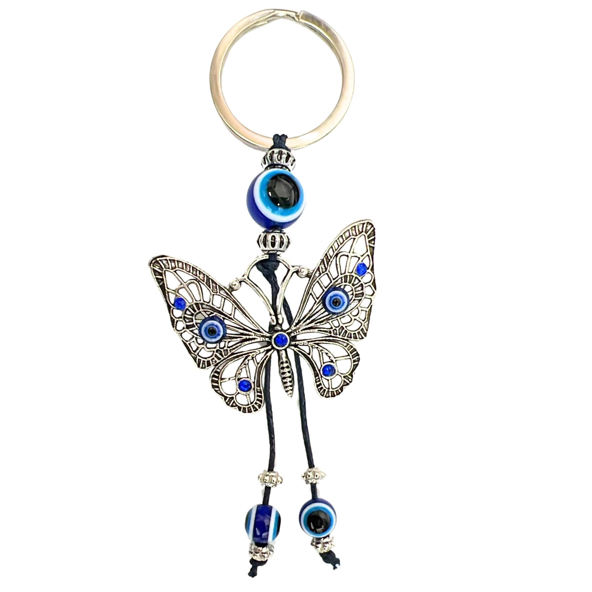 This elegant keychain features a sparkling blue butterfly accented with rhinestones and a classic evil eye charm, combining beauty with protective symbolism. The butterfly represents transformation and hope, while the evil eye is believed to guard against negativity. Perfect for accessorizing keys, handbags, or backpacks, this lightweight charm also makes a meaningful and stylish gift.