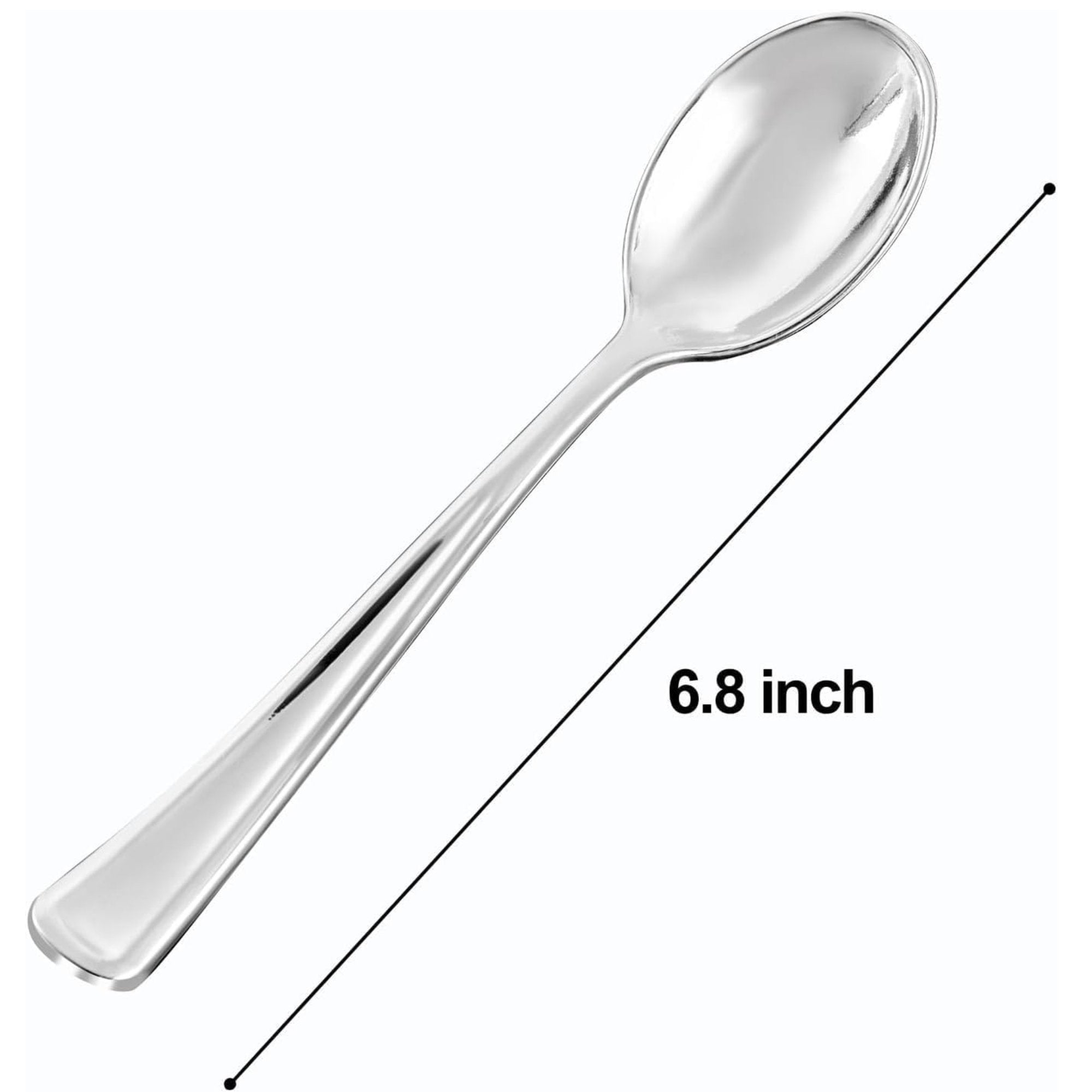 Upgrade your table setting with this 18-count pack of silver plastic spoons. Featuring a sleek metallic finish, these spoons offer the appearance of real silverware with the convenience of disposable use. Made from durable plastic, they are ideal for both casual and formal occasions, including parties, events, and everyday meals. Perfect for serving desserts, soups, and more with style and ease.