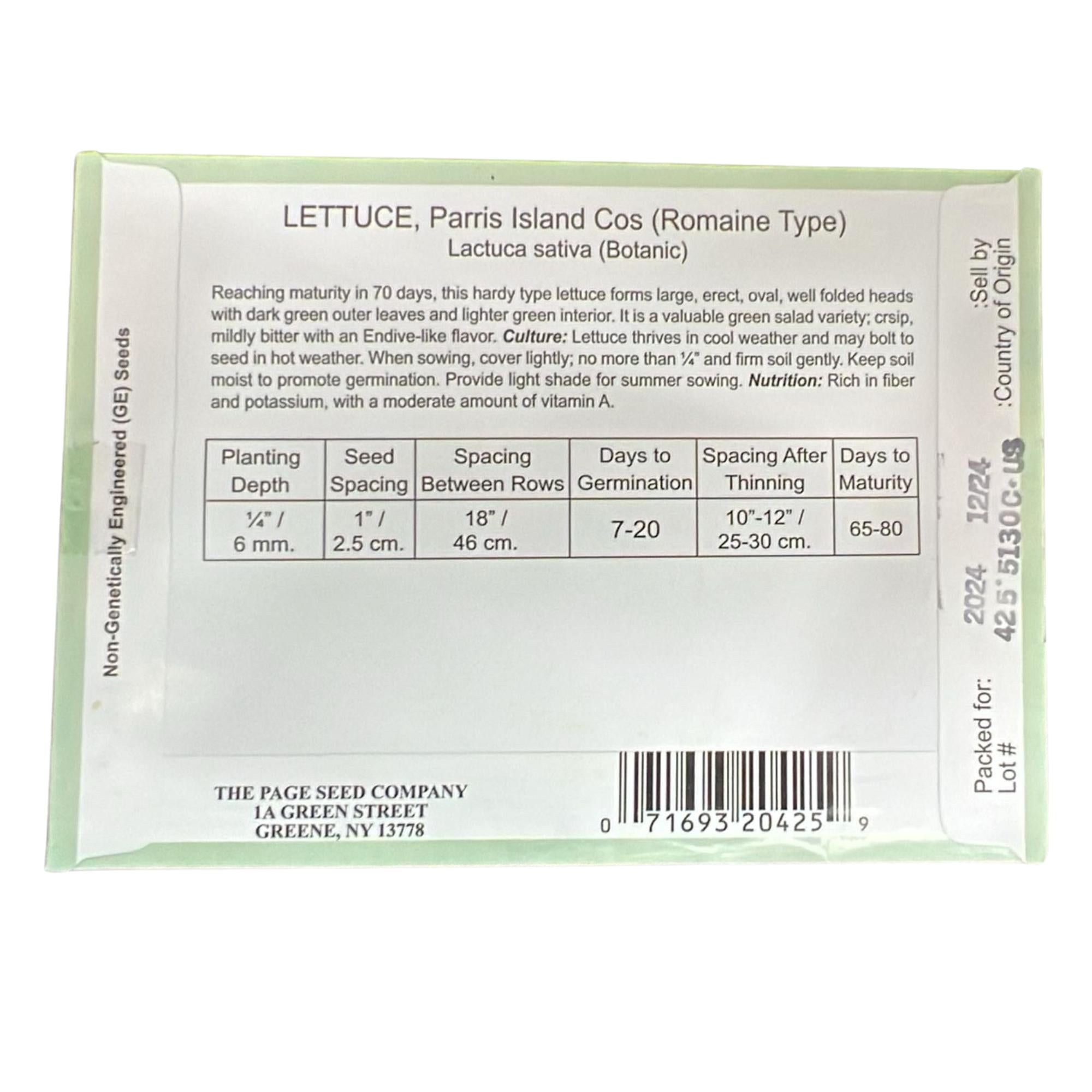 Parris Island Cos is a dependable romaine lettuce variety known for its crisp texture, upright heads, and sweet, mild flavor. This classic lettuce produces tall, dark green leaves with a creamy white heart, making it a favorite for Caesar salads and fresh dishes. Suitable for spring and fall planting, it germinates in 7–20 days and reaches maturity in 65–80 days. Ideal for home gardens, this variety performs well in both garden beds and containers.