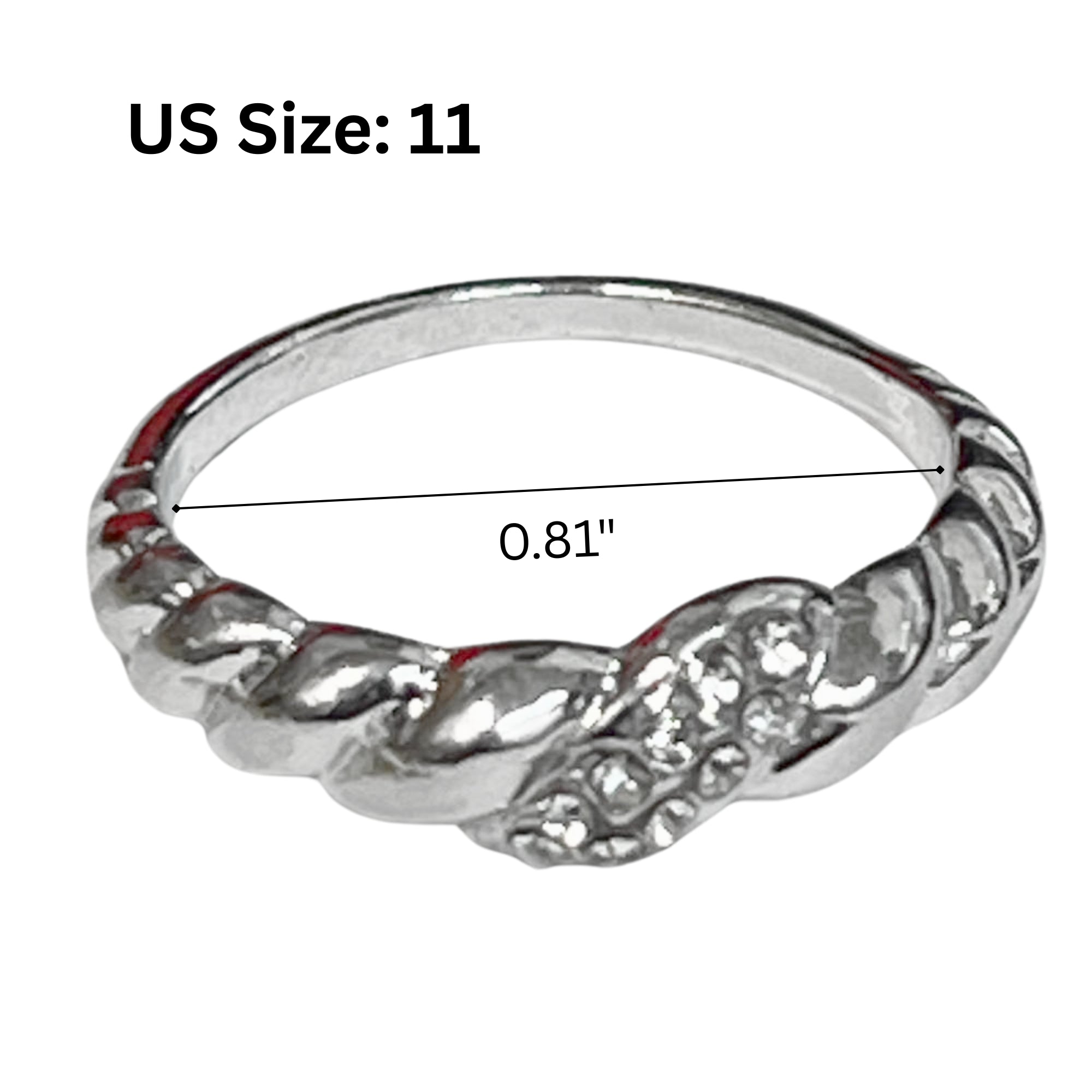 This 99-cent silver-tone ring features a braided band design with a decorative textured accent on the front. The smooth, polished finish wraps comfortably around the finger, while the raised detailing adds a subtle touch of style. With an inner diameter of approximately 0.81", this ring fits a standard US Size 11. Affordable and versatile, it can be worn alone or paired with other simple bands.