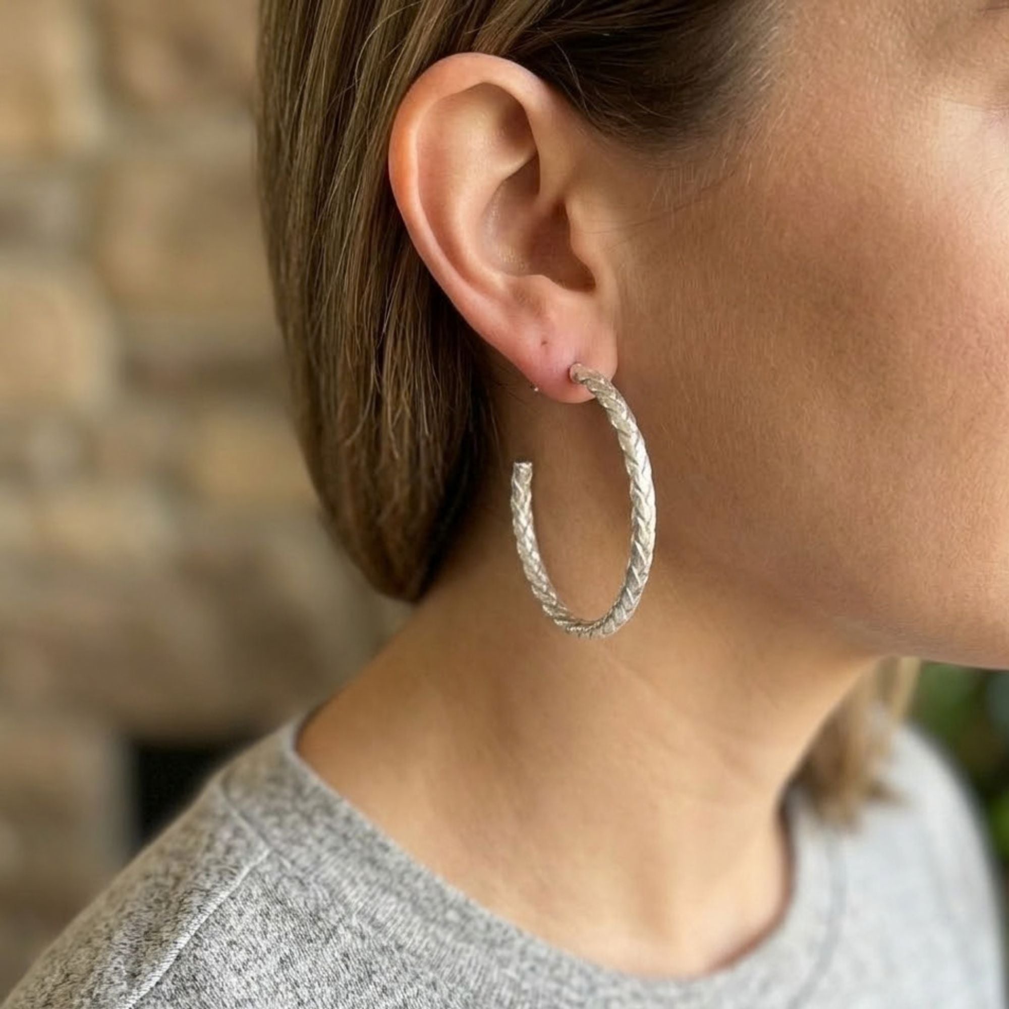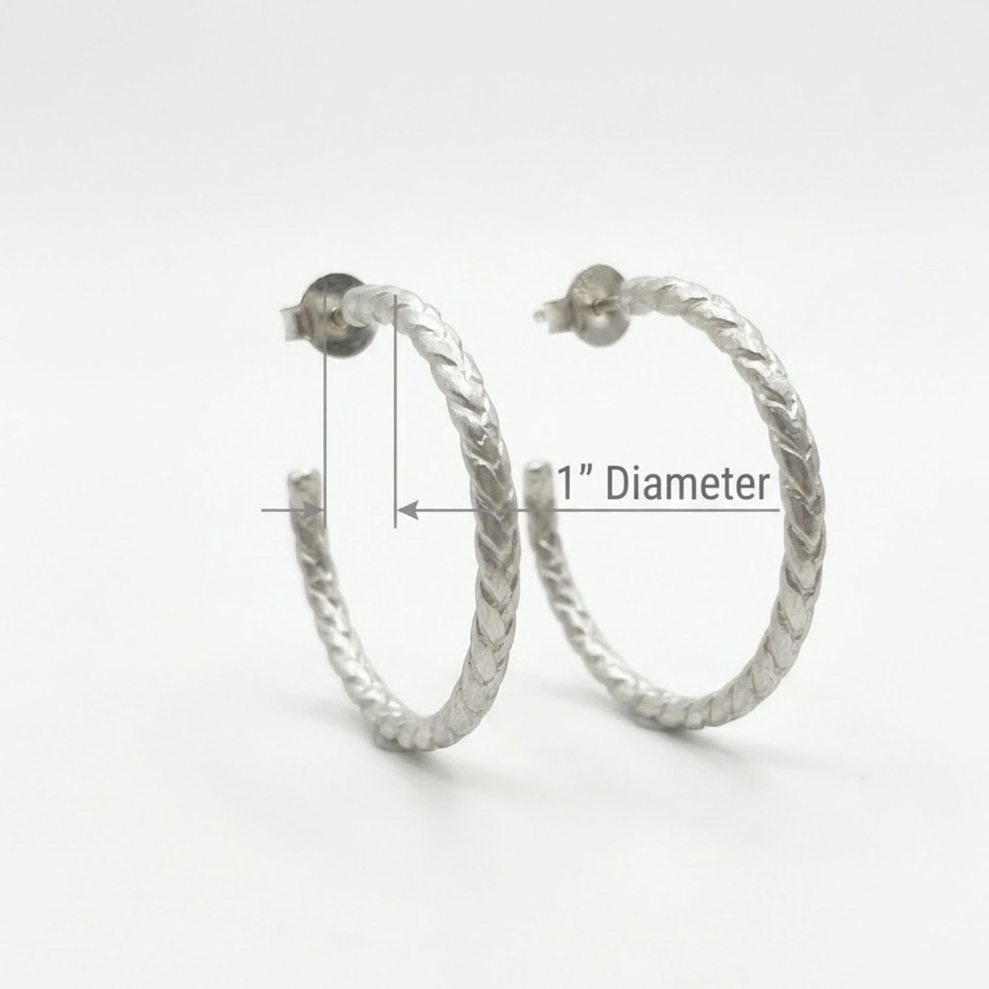 Add a stylish touch to your jewelry collection with these textured silver hoop earrings. Designed with a unique braided-style texture and a 1-inch diameter, these hoops bring subtle detail and shine to any outfit. Their elegant design makes them perfect for both everyday wear and special occasions.