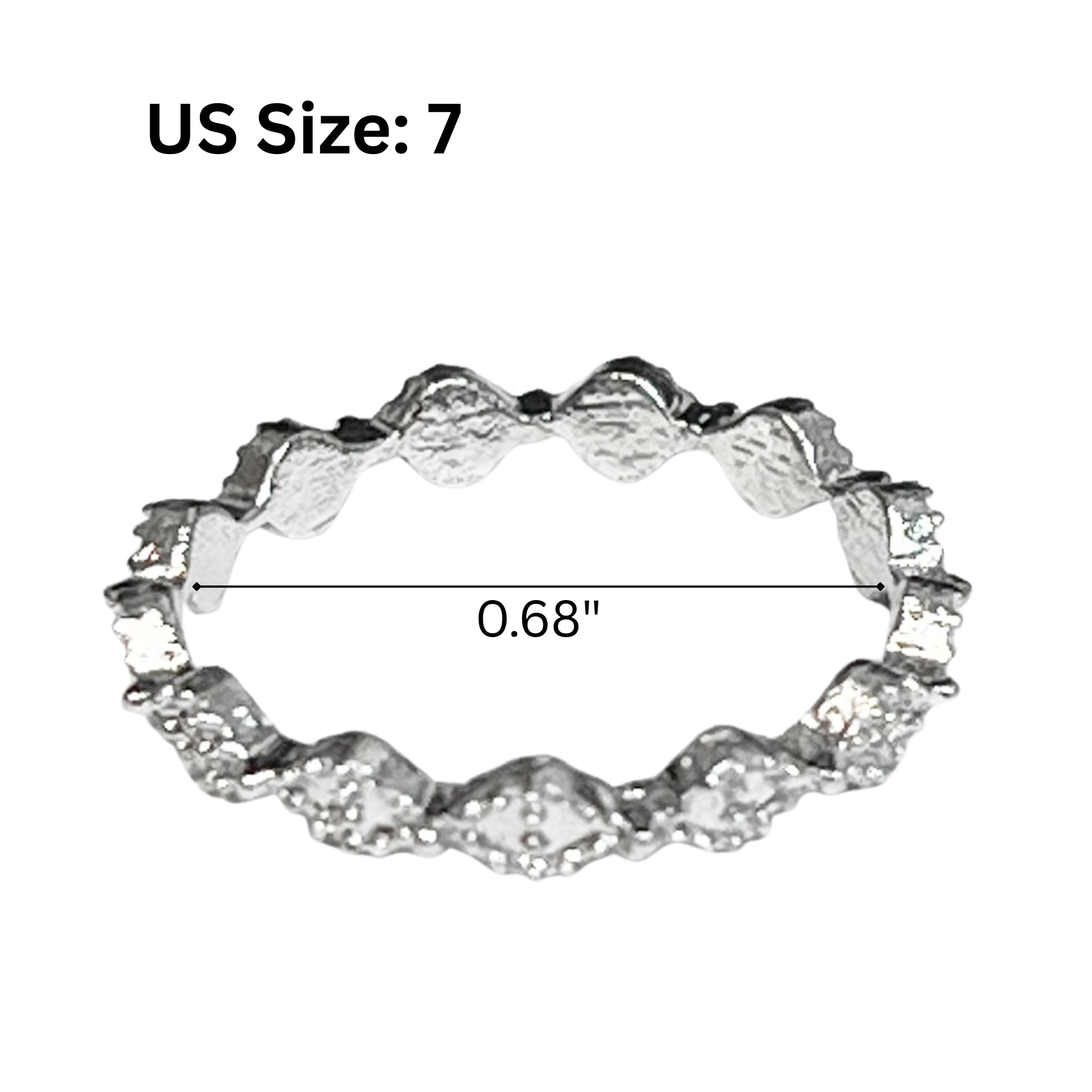This 99-cent silver-tone ring features a fully textured, sculpted band with an organic wavy pattern. Designed as a US Size 7, it has an inner diameter of approximately 0.68", as shown in the image. The lightweight construction and unique surface details make it an easy everyday accessory, perfect for stacking or wearing alone.
